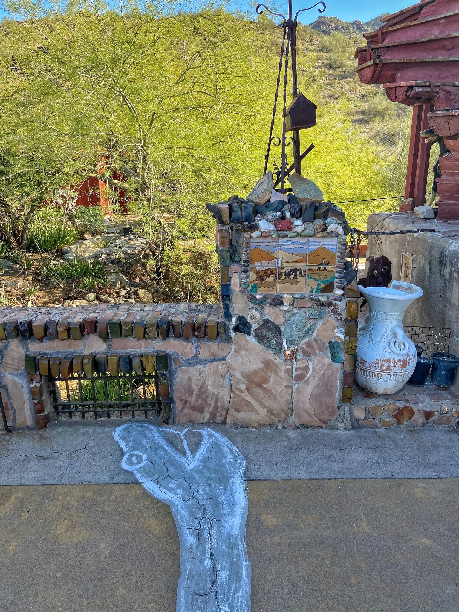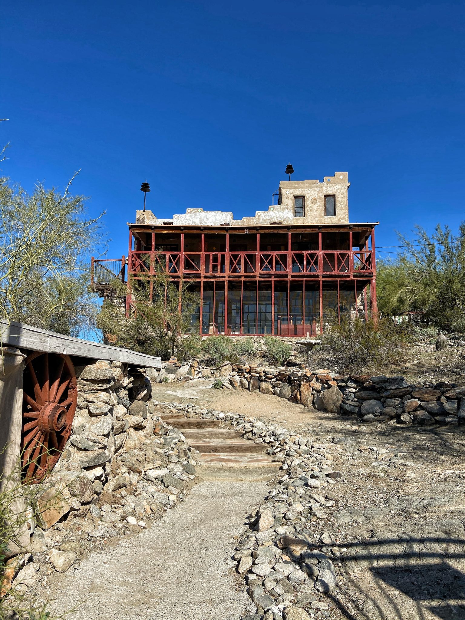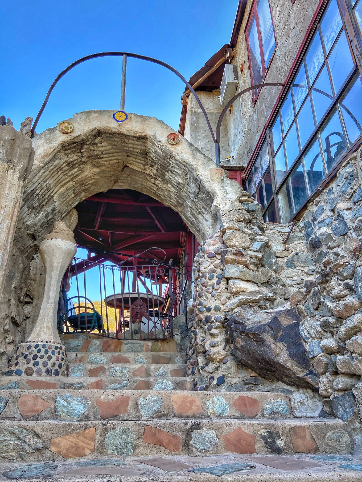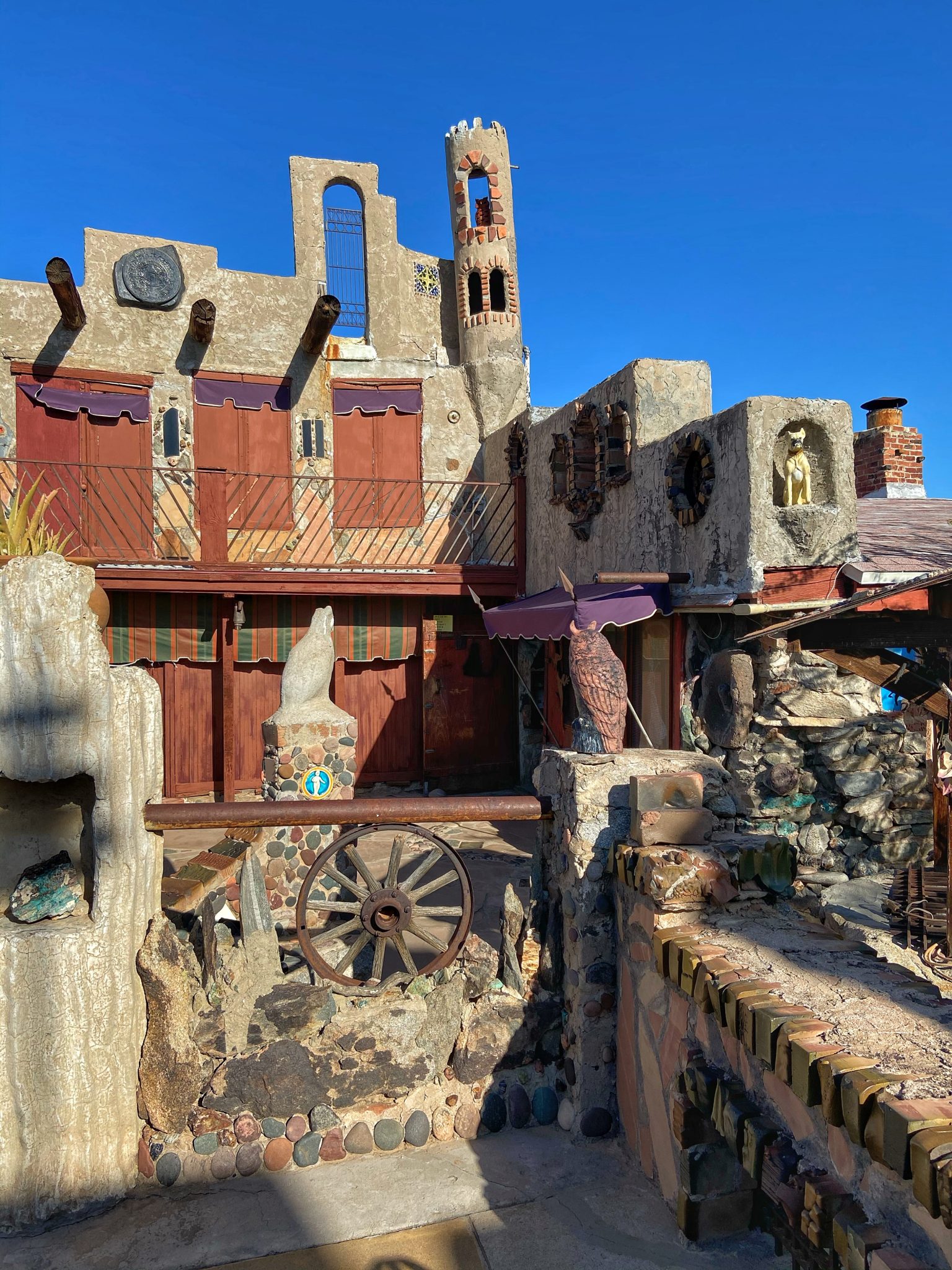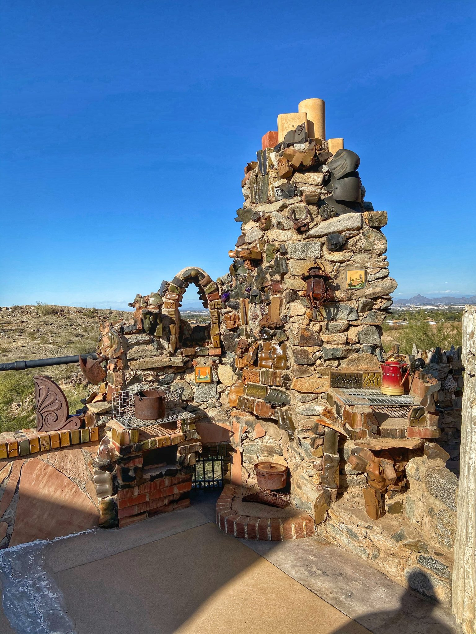 The “Mystery Castle” is located in the south part of Phoenix, just along the foothills. I took the bus and then walked a short 15 mins through a residential neighborhood where it turns off into park trails and the dirt road entrance to the Castle.