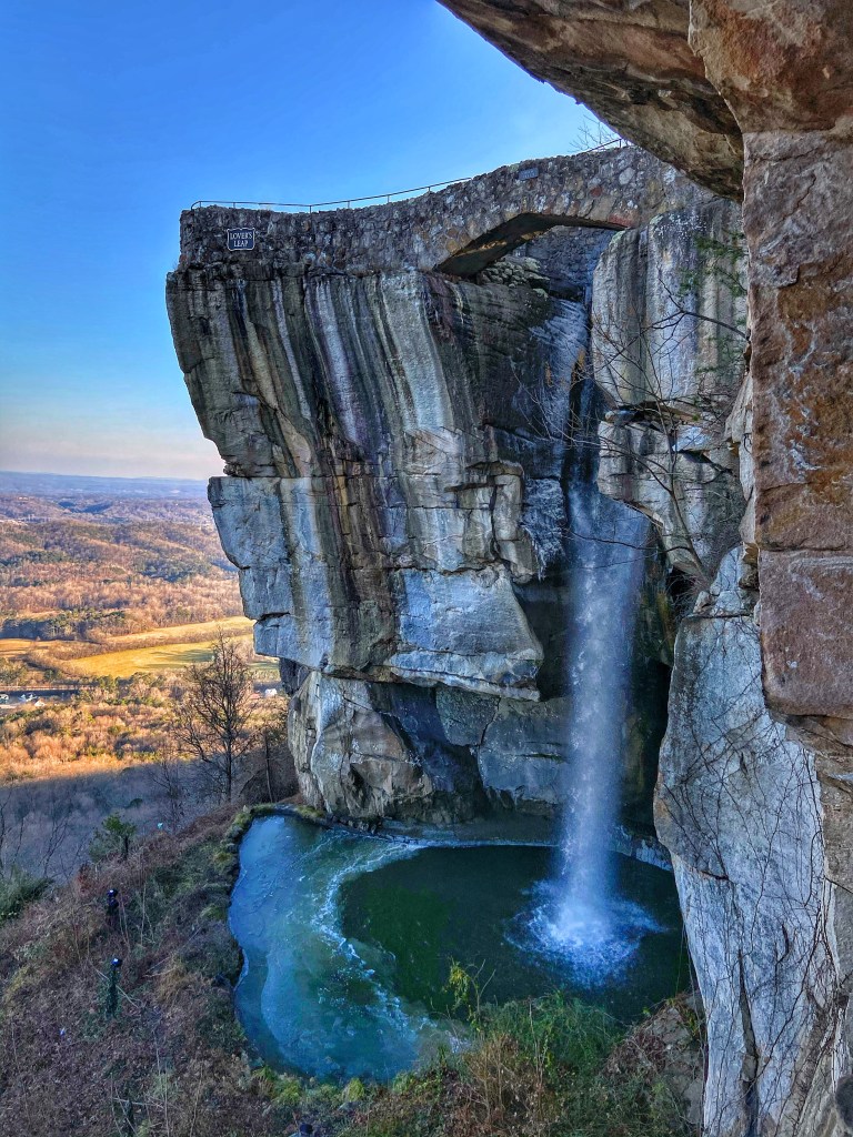 Lookout Mountain was originally home to Native American tribes. Lovers Leap falls stand at 140ft and legend says that a Chickasaw warrior named Sautee was in love with a Cherokee maiden named Nachoochee. They were in feuding tribes and when their hidden love was discovered, the Cherokee tribe captured Sautee and threw him off that point of Lookout Mountain. Nachoochee leaped to her death after him. The rock formation is natural but the falls are man made.